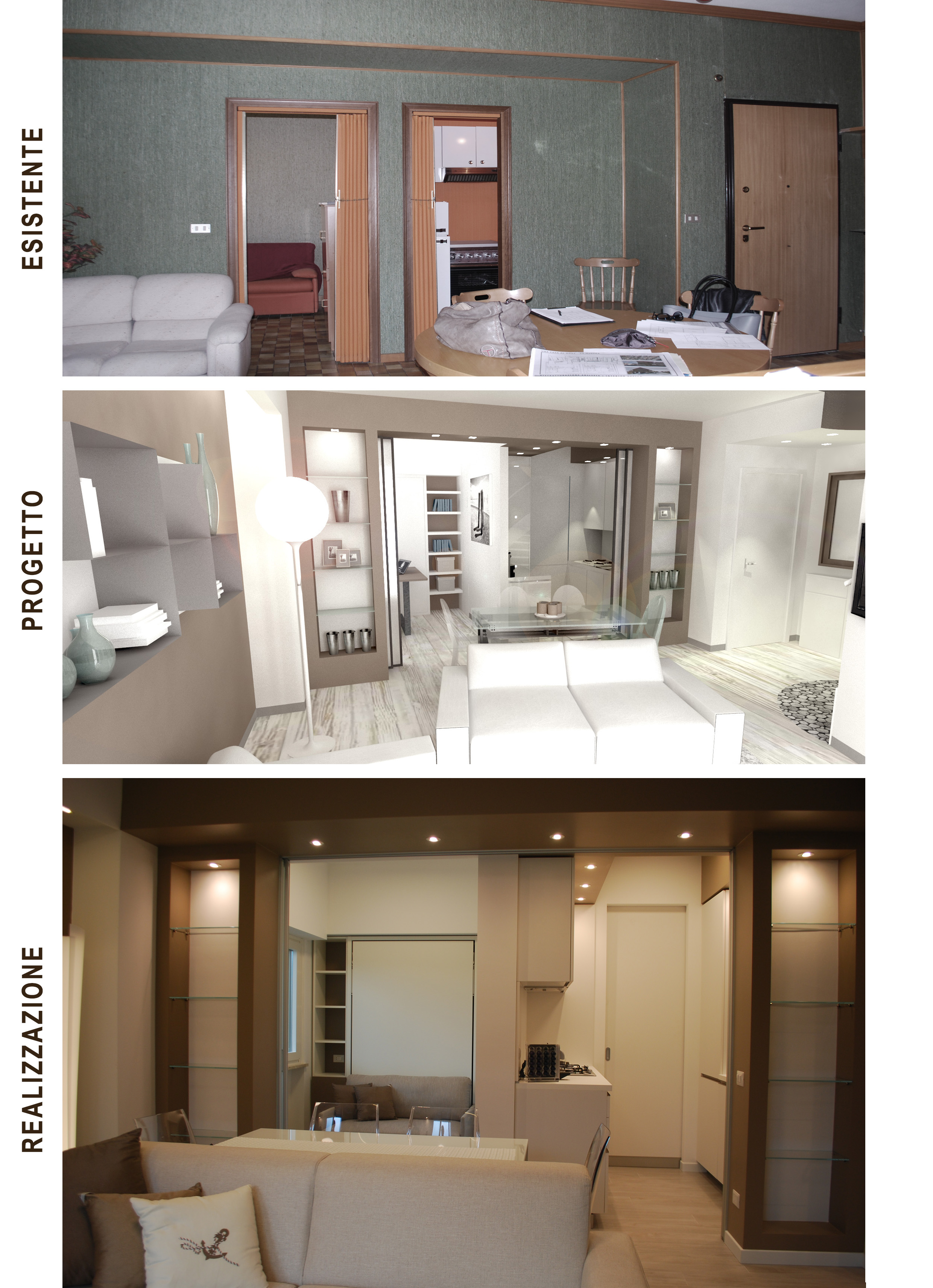 Si tratta di un’appartamento degli anni ’70 di cui abbiamo deciso di abbattere alcune murature creando un ampio living. Il lavoro è iniziato con un rilievo generale, lo sviluppo di un progetto completo, la scelta delle imprese e lo sviluppo dei preventivi: quando era tutto concordato siamo partiti con una demolizione quasi totale per poi ricostruire un’ambiente più funzionale aperto e spazioso, molto più giovanile.