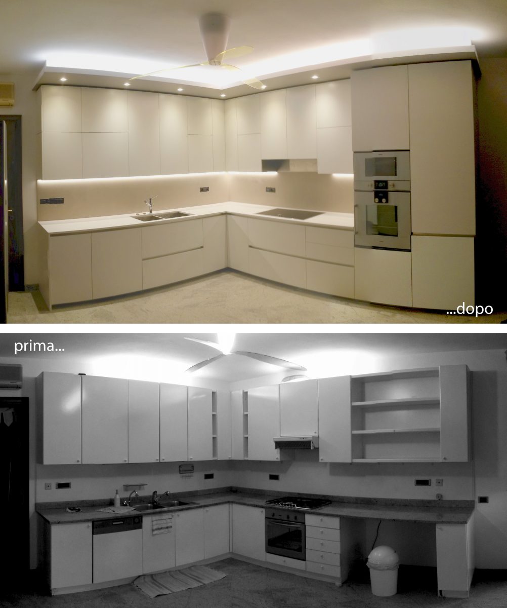 Si tratta di una sostituzione di cucina ad angolo nella quale abbiamo previsto prima un nuovo controsoffitto a cappello con illuminazione indiretta e gruppo faretti ad incasso. La nuova cucina è una Ernestomeda con anta a gola in finitura laccata, top in Gress Dekton ed elettrodomestici Gaggenau.
