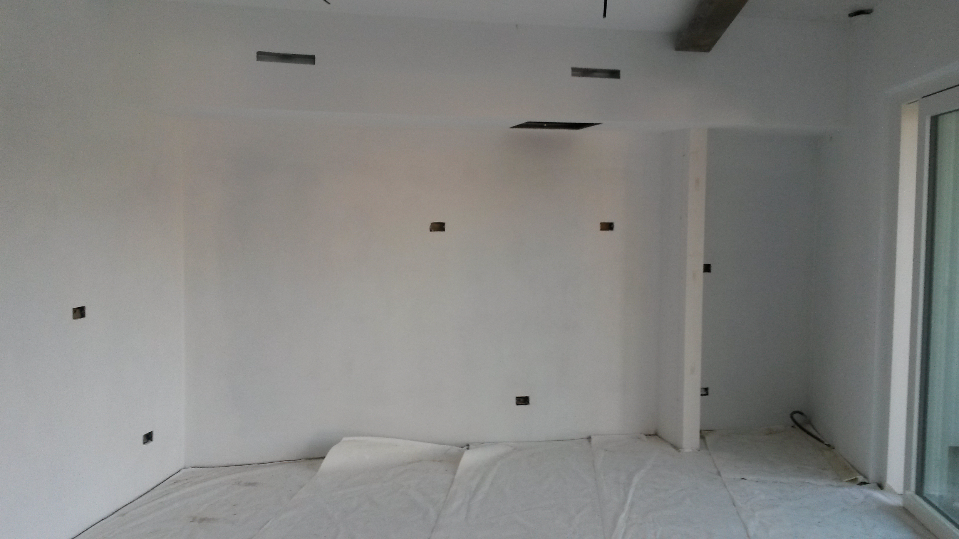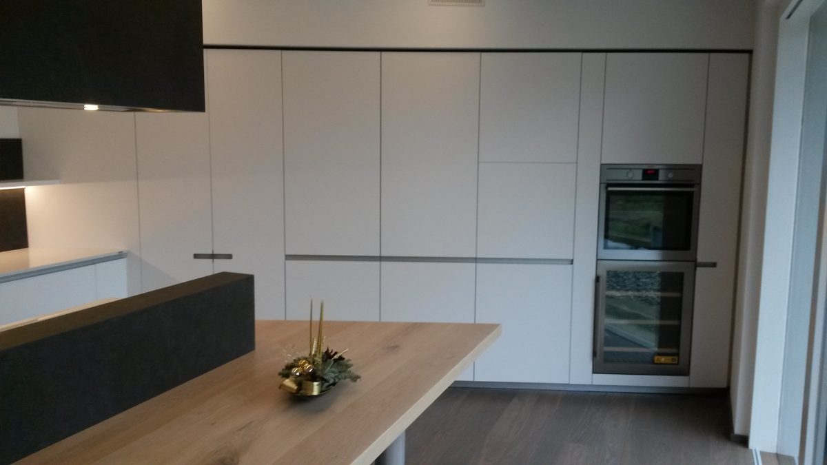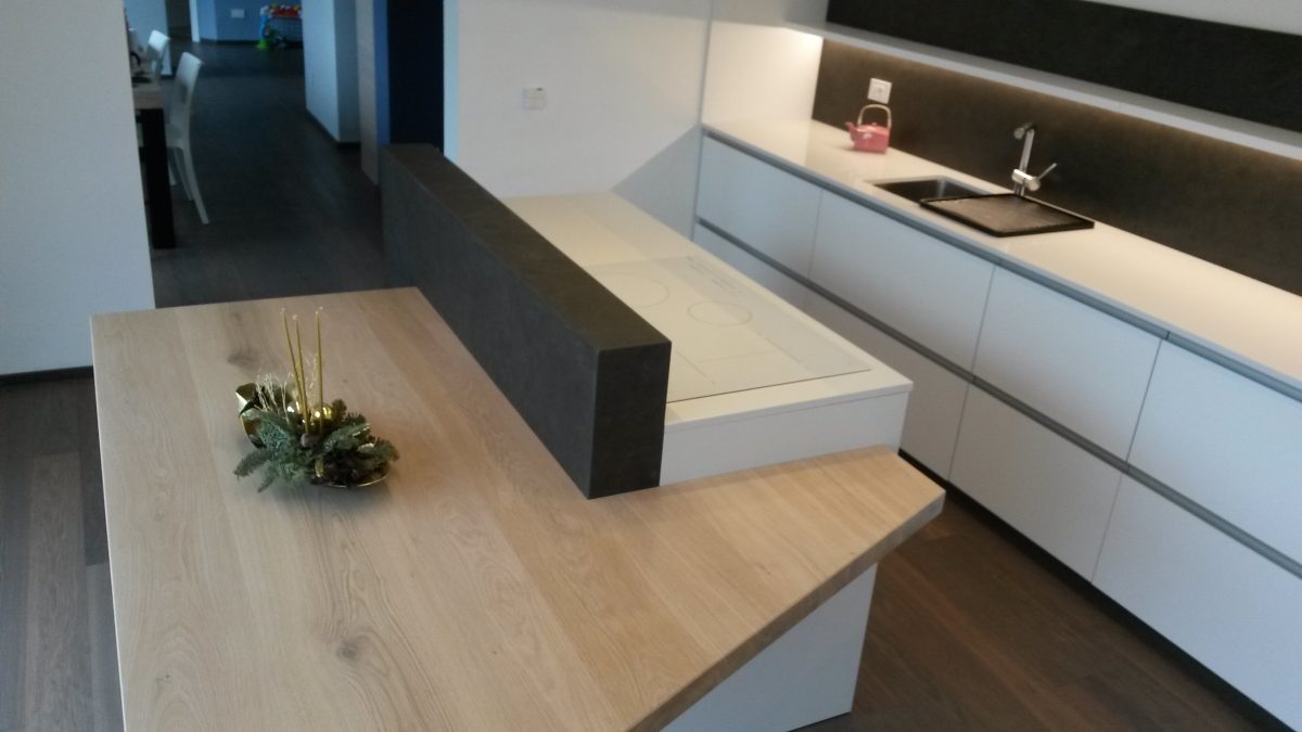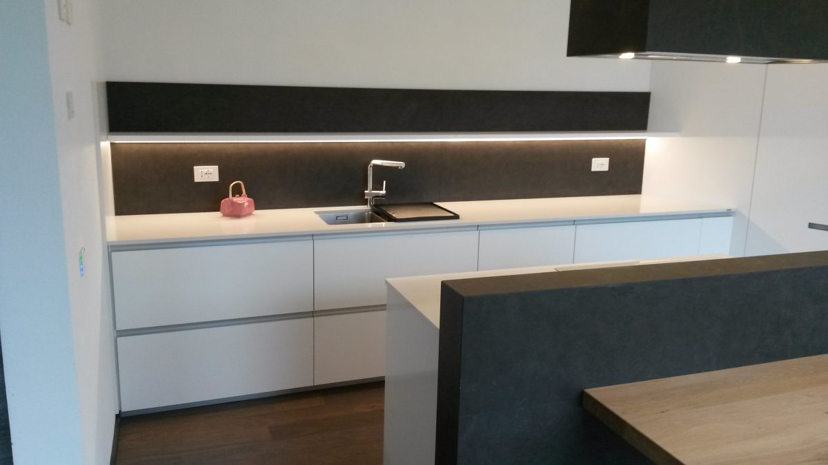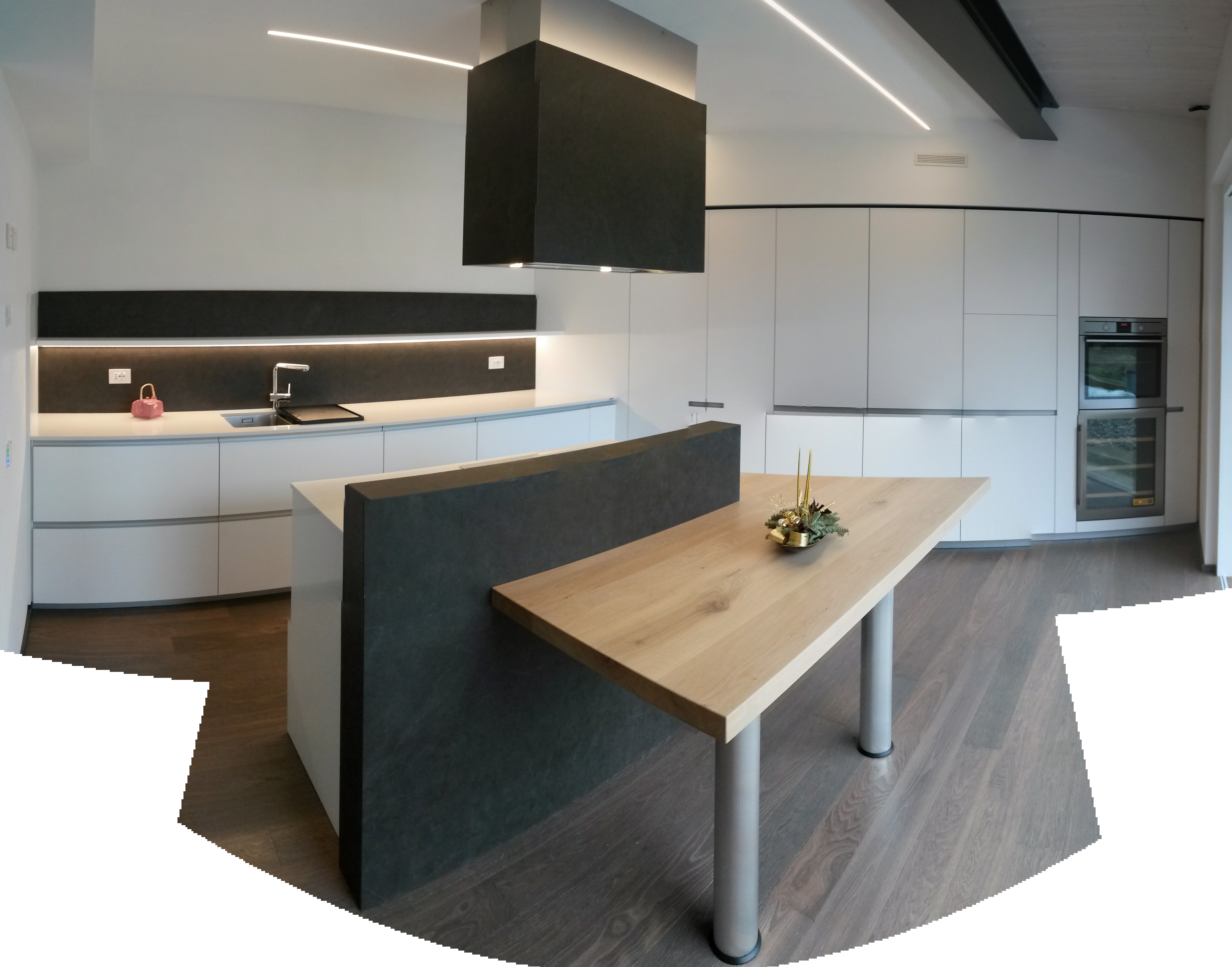 Si tratta di una grande cucina isola composta da una lunga parete di colonne attrezzate, una parete dedicata alla zona lavaggio e lavorazione e un’isola composta dalla zona cottura con annesso il tavolo da pranzo. La cucina è una Ernestomeda finitura Fenix, piani di lavoro in quarzo total white, poi la cappa, il muretto di divisione cottura/tavolo e lo schienale lato zona lavaggio sono rivestiti in Kerlite effetto venato scuro, mentre il tavolo da pranzo è realizzato con tavole massicce di rovere al naturale.