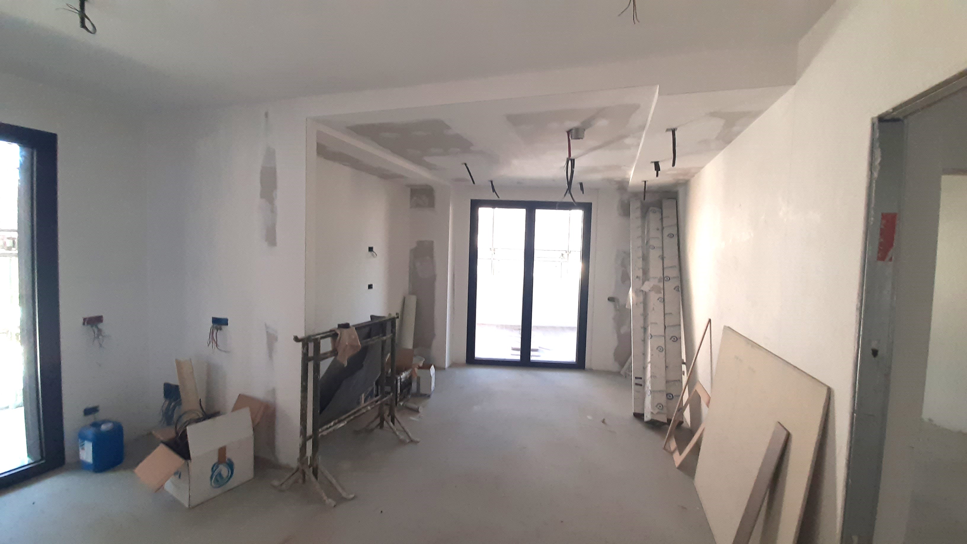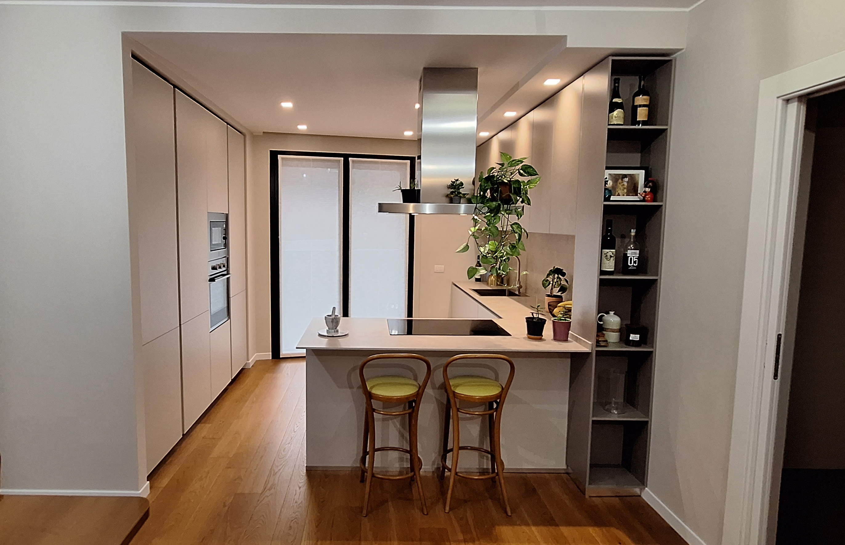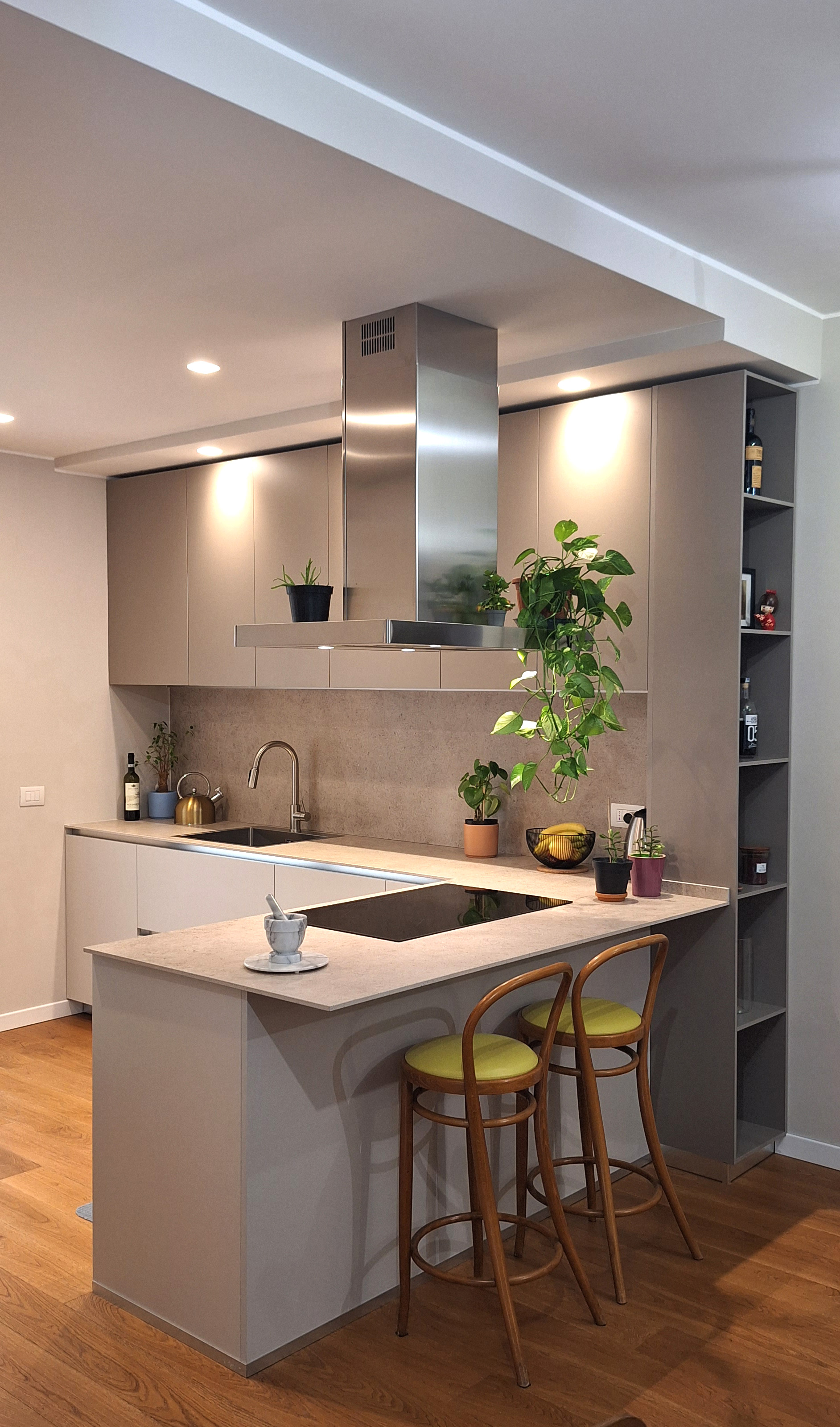 Si tratta di una cucina con penisola composta da una parete di colonne attrezzate nascoste alla vista da una nicchia in cartongesso e una zona di lavoro lato muro con penisola comprendente piano cottura con cappa isola, piano per colazione e libreria. Il cartongesso poi prosegue sul soffitto sottolineando tutta la zona con l’illuminazione a punti e scendendo sui pensili ingloba tutto il progetto all’interno di una nicchia. La cucina è una Ernestomeda finitura Himelamine piani di lavoro in quarzo ABK effetto pietra, gli elettrodomestici sono Electrolux