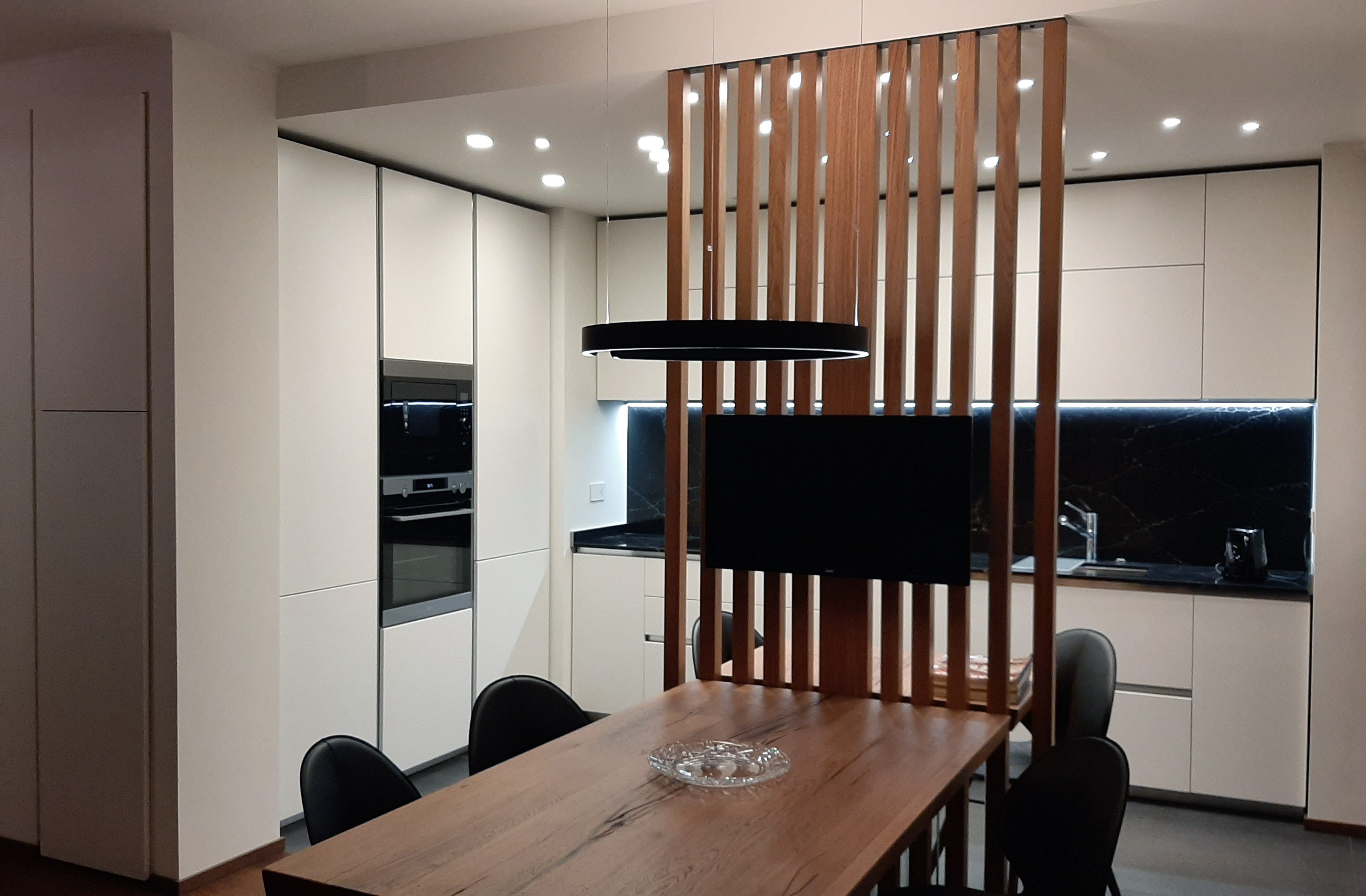 Il tavolo da pranzo doveva essere il fulcro del progetto ma doveva anche essere presente un piccolo tavolo per i pranzi veloci o come servizio per la cucina: da qui nasce l’idea del grigliato che filtra in parte la vista della cucina dalla zona pranzo, ma offre anche un punto di collegamento per i due tavoli, e l’alloggiamento al televisore in ottima posizione sia per il pranzo che per la zona relax.